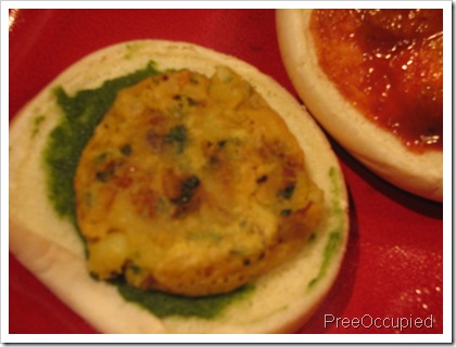 I use regular hamburger buns for my Vada Pav. Spread the green chutney on one half of the bun and the tamarind chutney on the other. Place the Vada between the two buns and lightly press with the palm of your hand.
